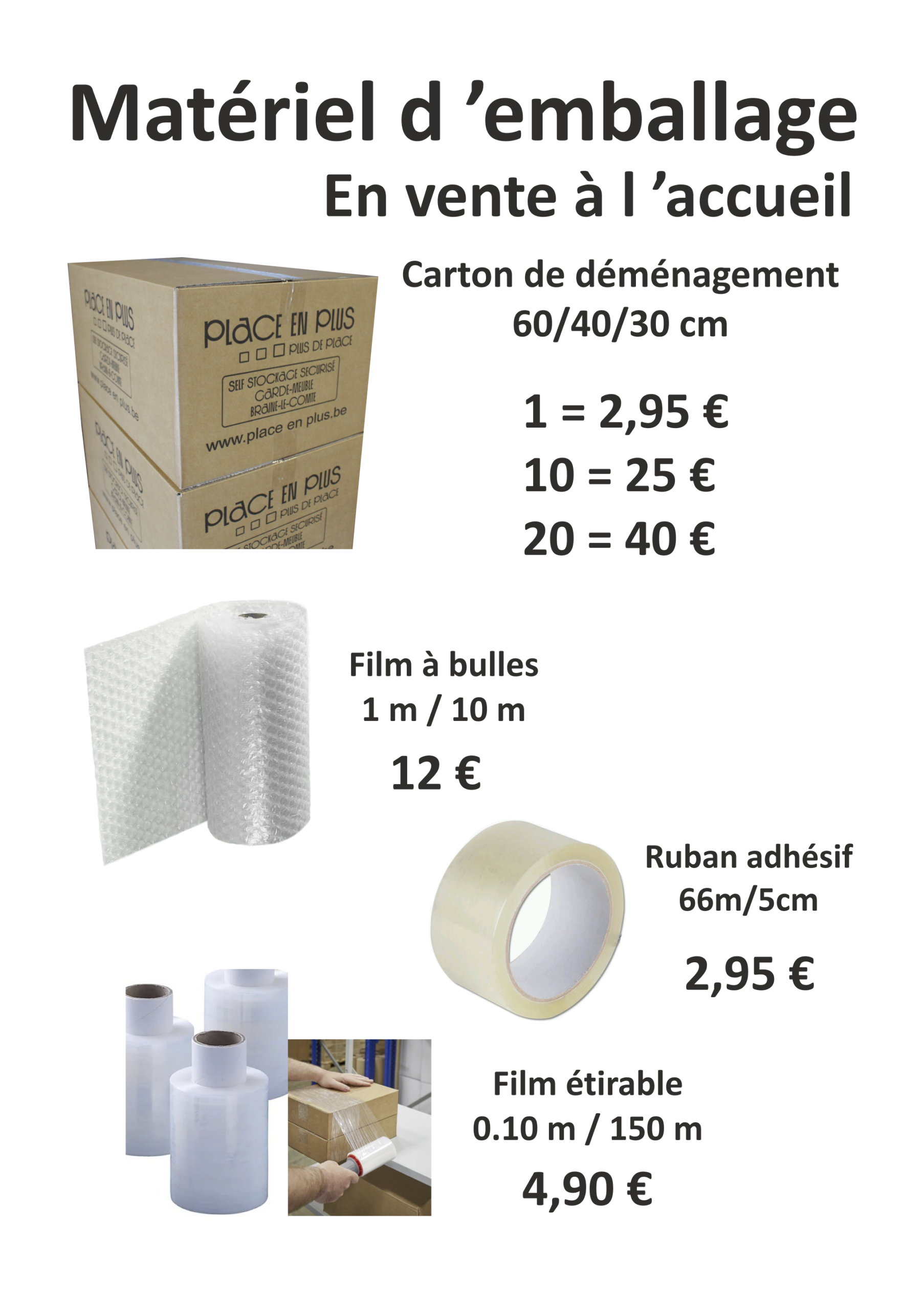 Assortiment complet de matériel d’emballage en vente à l’accueil à des prix imbattables. Cartons de déménagement en différentes tailles,ruban adhésif, protection, etc…